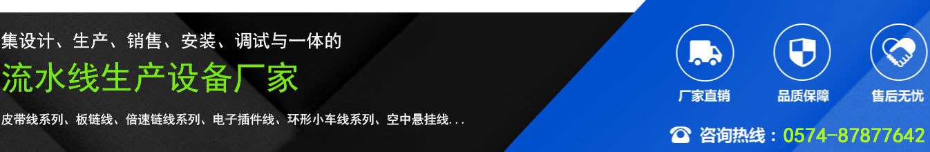 是一家集開發(fā)、設(shè)計生產(chǎn)、營銷、安裝、調(diào)試與一體的寧波流水線生產(chǎn)廠家。產(chǎn)品有:皮帶線系列、板鏈線、倍速鏈線系列、電子插件線、環(huán)形小車線系列、空中懸掛線、動力滾筒線、無動力滾筒線系列、皮帶線彎道、無動力裝配工作臺以及各種非標(biāo)配套設(shè)備.